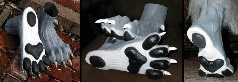 Our basic wolf feet, with your choice of skin, pad and claw color. The combination on the right is light grey skin with black paw pads and white claws; on the left is black skin with red pads and claws. While we call these wolf paws, these hindpaws done in all black make great fox feet.