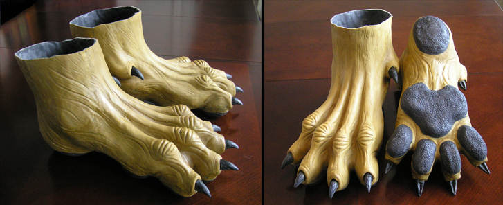 These huge, aggressively textured feet will fit up to a size 14 (American) foot. From claw tip to heel these paws are over 15" long. Due to their size, the hindpaws are foam filled and wet suit booties are incorporated into the paws. Shoe size must be specified at the time of ordering, as well as your choice of skin, pad and claw color.