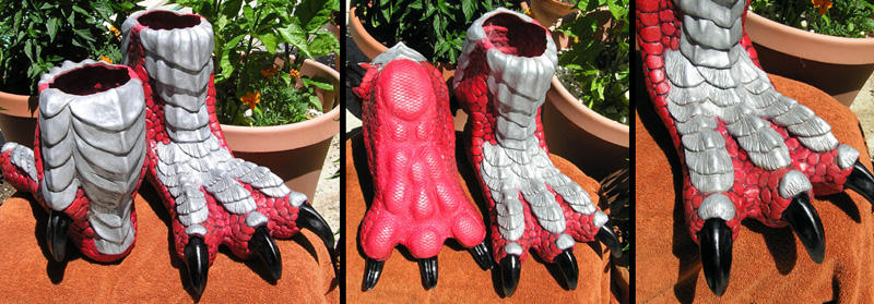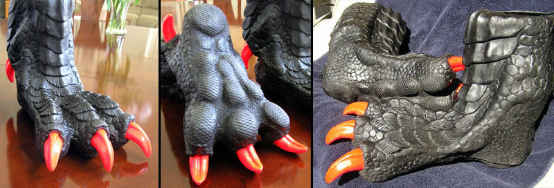 Designed to slip on over shoes, these feet in their base configuration have no additional padding. The soles have embedded cloth reinforcement. Additional cloth reinforcement is included in the the main body of the foot as well, to help it maintain its shape. Claws are hard resin.