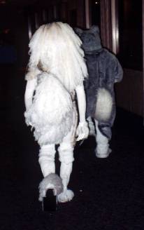 Went to the fursuit lounge for the clothing & props SIG and the carving a head SIG. Teddy Ruxpin's info was interesting. Lance Ikegawa's tips on foam, adheasives, and construction were some of the best information I got at CF9, as well as close-up looks at his Hyena (Chase), Steele, and Frost heads. Passed Silvermane's head around as well. The demo ran well over, and I barely had time to say 'Bye to Brokken before he left.