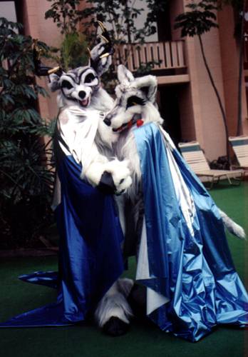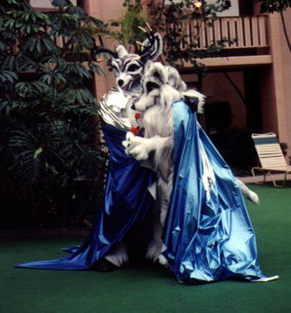 Looking out our room window I see Lance Ikegawa and Heather Riesen posing at poolside in the Frost & Fire fursuits and hotpaw it down to take pictures - wearing Silvermane, of course. Using a viewfinder with a muzzle in the way was a unique experience.