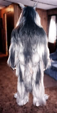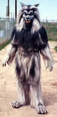 Now fur is added to the suit, using different colors and lengths as needed for the broad markings. Then we trim the fur and detailed markings are airbrushed in. Sometimes, the fur is kept as a separate second suit, worn over the muscle suit, if the werewolf is going to be used for film work. Having two separate suits looks more realistic, but means a lot of maintenance time to keep it repaired. FYI, we use National Fiber Technologies fur for our suits. It's totally artificial but looks and feels much like real animal fur. Here's DarkFang with his fur. You can see how the foam buildup under the fur affects the way his body looks. You can also see why this type of costume is called a "fursuit." |
