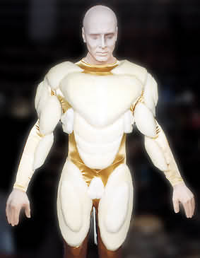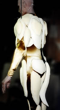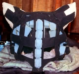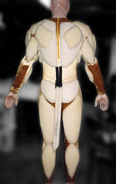 Now work proceeds to the fursuit itself. First, a one-piece cotton/lycra diveskin is put on a form that's been built up to match the actor. Strapping is layered over the suit to help it hold it's shape when the weight of fur (and all that sweat when performing!) is added. Then, the muscles and body form are built up as needed out of foam and attached to the diveskin. Recently we've been using open-cell foam to improve how the suit breathes.