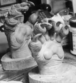 These are the sculptures for Silvermane's fore paws (hands). They were originally sculpted in roma over lifecasts of hands just as the head was. Claws were inserted into the sculpture to be sure how the finished paws would look.
