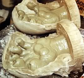 The next step is making the underskull for the head. It's made out of fiberglass and serves to hold the shape of the skin and the teeth (sculpted and molded separately, and made from dental acrylic). It also lets the jaw move realistically, and allows for other motions, such as a snarl. The skullcap fits over the actor's head. Newer heads are using a cap made from lighter foam instead.