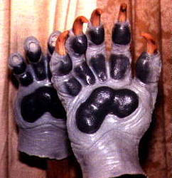 Once pulled from the molds, the forepaws and hindpaws must be trimmed of flashing; that's the latex that settled into the line between the two halves of the molds. After a little touch-up work these mold lines are almost invisible. Now the paws are given a base coat of paint like the face skin, then detailed with an airbrush. We color the latex so when the paint does wear off it's not as obvious, as with hard use the outer layer of latex and paint does wear away. To the left are Silvermane's painted fore paws. One paw has the claws inserted back in.