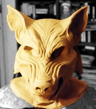 First, we begin with a lifecast of the actor's full head and shoulders. We then sculpt the werewolf's head on top of the lifecast, beginning with building up a rough shape and ending with the very detailed final sculpture (to the left is Silvermane's sculpture). This final sculpture even includes fine skin texture and pores. Because of the fine detail we like to use Roma Plastalina to sculpt in. It's a bit harder than water-based clay so holds fine detail better, and because Roma is oil-based we don't have to worry about the sculpture drying out and cracking. Notice that we don't put the teeth in the head at this point.